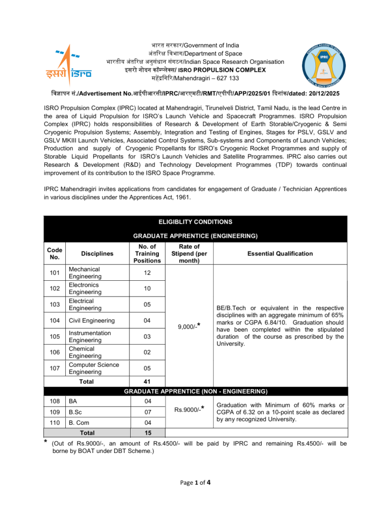 | Graduate Engineering Apprentice | 10 January 2026 | 09:30 AM to 12:00 PM | ISRO Propulsion Complex (IPRC), Mahendragiri, Tirunelveli District, Tamil Nadu |